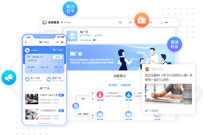 推广员分销、好友集call、新人有礼等多种社交裂变营销玩法